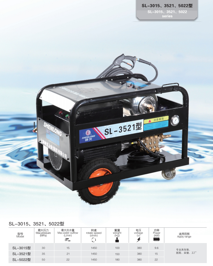 上海神龍集團生產(chǎn)的高壓清洗機SL-3015、3521、5022型清洗機,適用洗車場、汽修廠、建筑工地、外墻、防疫消毒、小區(qū)物業(yè)、工礦企業(yè)等。